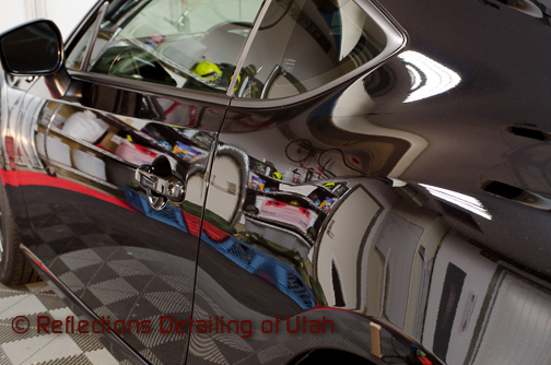 You can see the clarity of the reflections in the paint, crisp and clean. Many owners think the “wax” is what creates the reflections, not so much. Polishing is credited with nearly 90% of the look a car has, the “wax” is the make-up that protects the finish the polishing created. You can put lip stick on a pig and its still a pig- you can put the most expensive wax in the world on a poorly polished surface and it can’t improve the appearance like proper paint polishing creates. Now remember this is a brand new car, the dealership only took off the shipping wrapping, they were told not to wash it! This car was Au Natural as it can get, yet it needed polishing to bring out the greatest effects. The LSP or last step process is just the make up for the surface, however polishing is the surface surgery that alters the appearance.